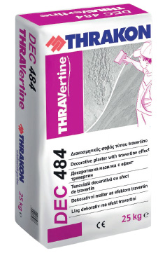 DEC 484 Thravertine е декоративна, суха, варо-циментова мазилка за вътрешно и външно приложение с отлична паропропускливост и влагоустойчивост. Съдържа бял цимент, хидратна вар, минерални пълнители, фибри и добавки. Използва се за декоративно оформление на цели стени или отделни декоративни елементи като колони, пиластри, камини, и др. След обработка и структуриране създава гладка или пореста текстура с ефект на камъка травертин, класическа тухла, груб бетон, кора на дърво и др.