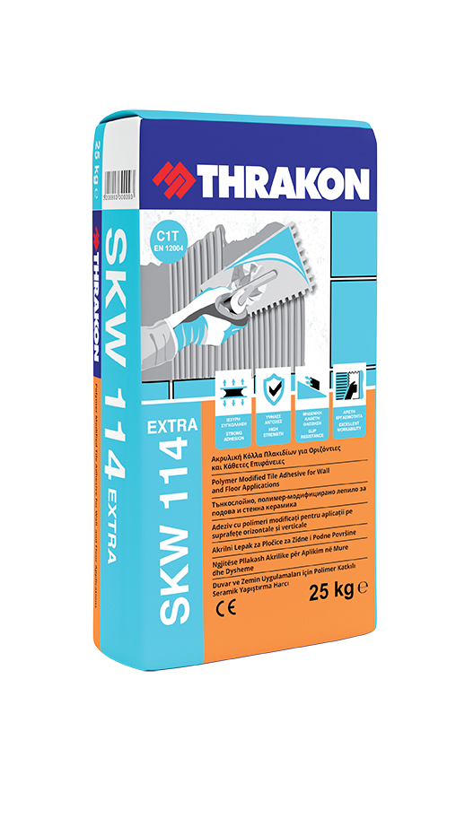 SKW 114 е полимер-модифицирано тънкослойно лепило за вътрешна и външна употреба на циментова основа за лепене на керамични, теракотни, мозаични и малки декоративни плочи върху разнообразни повърхности в сухи и мокри помещения. Мразо и водоустойчиво, особено подходящо за лепене на плочки върху вертикални повърхности.