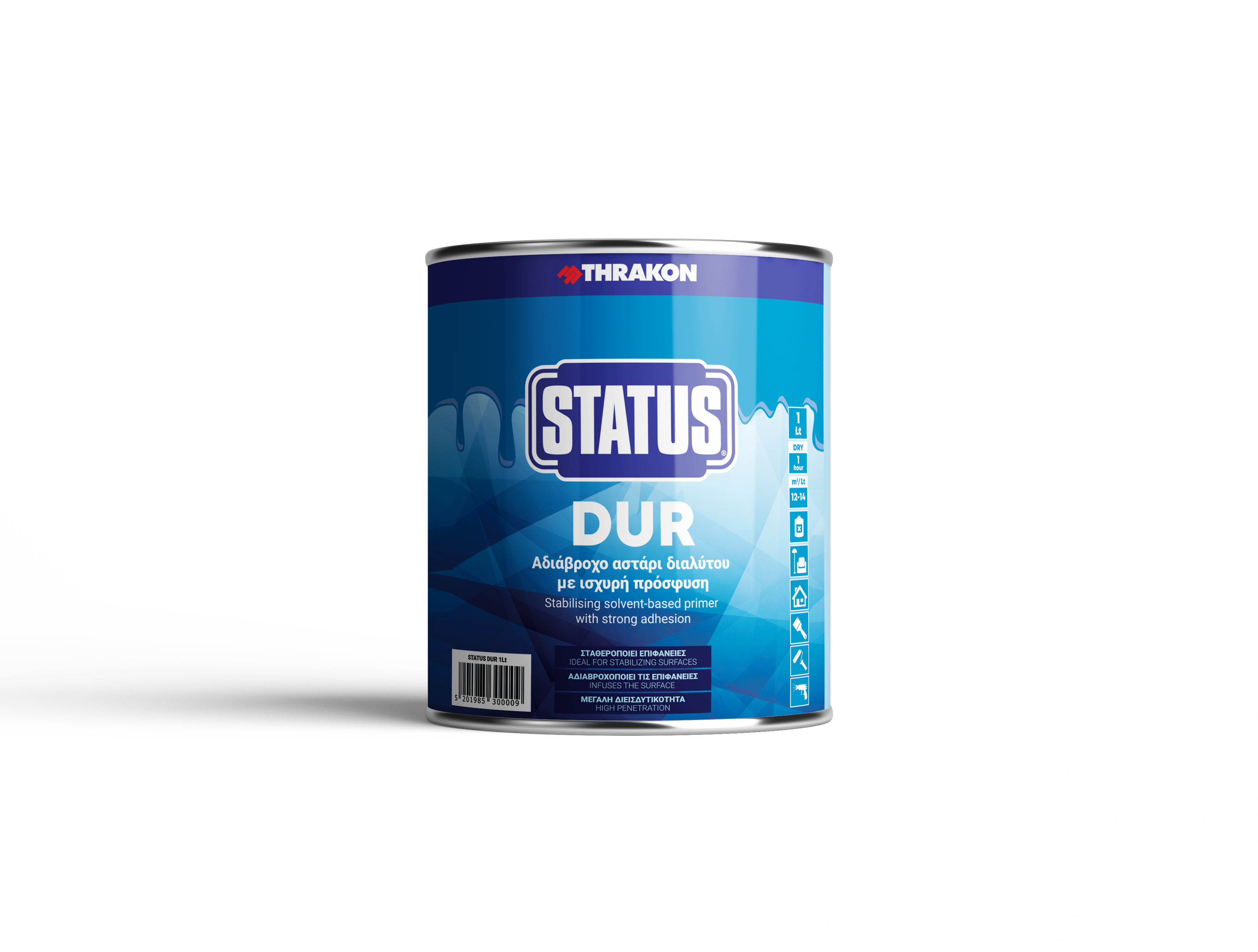 STATUS DUR е прозрачен, водоустойчив, акрилен грунд на основата на разтворител. Високата му проникваща способност го прави идеален за подготовка на всякакви нови или стари порести повърхности, като мазилка, тухли, бетон, шпакловани стени и др. Той е и най-доброто решение за повърхности с варова мазилка или некачествени стари бои. Импрегнира и хидроизолира повърхностите, като същевременно им позволява да дишат. Това е най-добрата основа преди боядисване с емулсионни, акрилни, релефни, циментови покрития или изолационни материали. Стабилизира импрегнираната повърхност и осигурява здрава адхезия към основата за последващо покритие,подобрявайки ефективността на боята, нейното покритие и устойчивостта на крайния слой. Заменя традиционното ленено масло, изсъхва по-бързо, без да оставя жълтеникав оттенък.