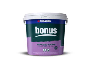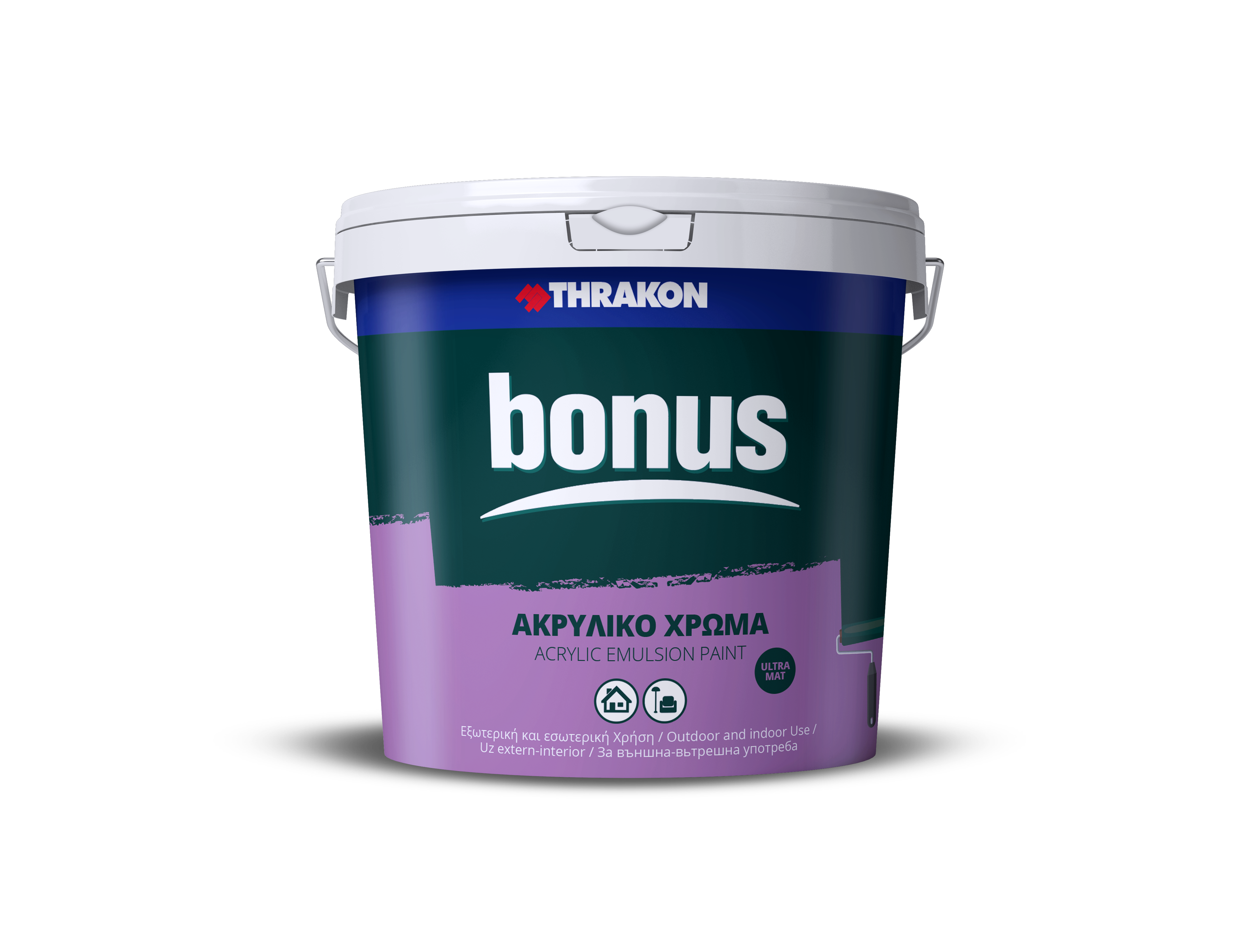 BONUS ACRYLIC is an acrylic emulsion paint for interior and exterior use.Specially designed for professional use it is suitable for areas requiring frequent painting and freshening up, such as public buildings, schools, hospitals, hotels, stairwells, storage rooms, ceilings, and surfaces soiled with graffiti, etc. It is odourless and absolutely user and environment-friendly. It is easy to apply, has exceptional coating qualities, resistant to adverse weather and high performance.