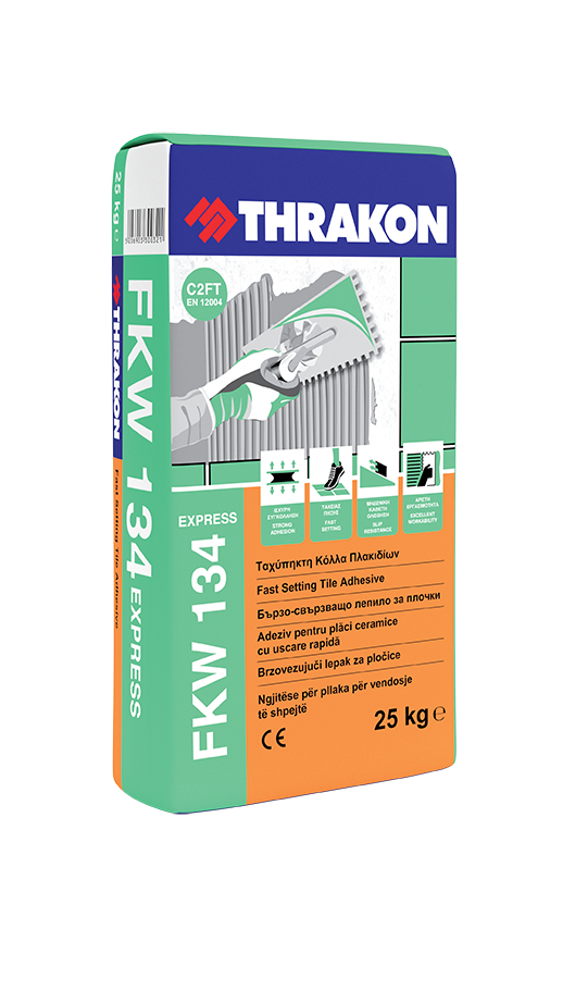 FKW 134 is a quick-setting, thin layer, cement based tile adhesive. It is polymer modified and suitable for applications on both horizontal and vertical surfaces. It consists of fast setting cement, quartz sand, mineral fillers and admixtures. It is classified as type C2FT according to EN 12004.
