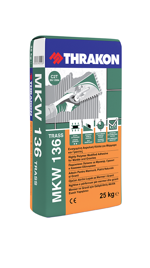 Κατάλληλη για χρήση σε οριζόντιες και κάθετες επιφάνειες σε εσωτερικούς και εξωτερικούς χώρους και για εφαρμογή σε μεγάλα πάχη. Αποτελείται από τσιμέντο, ασβεστολιθικά αδρανή (μάρμαρο) και βελτιωτικά πρόσθετα. Η MKW 136 έχει πολύ ισχυρή συγκόλληση σε όλα τα συνήθη υποστρώματα και υψηλή αντοχή στις καιρικές συνθήκες (βροχή – καύσωνα – παγετό). Επίσης προστατεύει τις επιφάνειες των μαρμάρων από το λέκιασμα. Το προϊόν παρουσιάζει θιξοτροπική συμπεριφορά και κατατάσσεται ως κόλλα τύπου C2Τ με βάση το ΕΝ 12004.