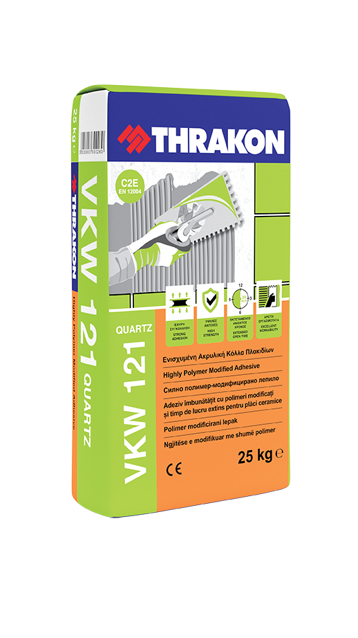 Τροποποιημένη με πολυμερικά πρόσθετα τσιμεντοειδούς βάσης για χρήση σε οριζόντιες και κατακόρυφες επιφάνειες. Αποτελείται από τσιμέντο, χαλαζιακή άμμο, ασβεστολιθικά fillers και βελτιωτικά πρόσθετα. Η VKW 121 έχει πολύ ισχυρή συγκόλληση σε όλα τα συνήθη υποστρώματα και υψηλή αντοχή στις καιρικές συνθήκες (βροχή – καύσωνα – παγετό). Παρουσιάζει εκτεταμένο ανοιχτό χρόνο (μέχρι 30 λεπτά) με συνέπεια να αυξάνεται η παραγωγικότητα των συνεργείων. Κατατάσσεται ως κόλλα τύπου C2Ε με βάση το ΕΝ 12004 για εσωτερική και εξωτερική χρήση.