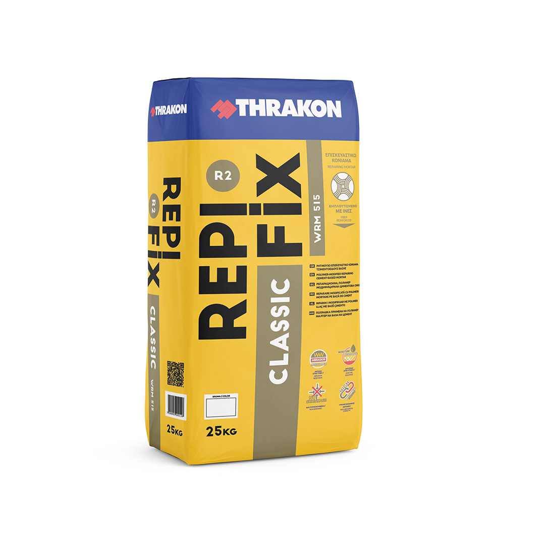 Το προϊόν REPIFIX CLASSIC WRM 515 είναι ένα ρητινούχο, επισκευαστικό κονίαμα για σκυρόδεμα, ενός συστατικού. Αποτελείται από τσιμέντο, χαλαζιακή άμμο και ειδικά και βελτιωτικά πρόσμικτα. Μετά την ανάμιξη με το νερό προκύπτει μια πάστα που μπορεί να εφαρμοστεί με μυστρί ή μεταλλική σπάτουλα στην προς επισκευή επιφάνεια. Το REPIFIX CLASSIC WRM 515 είναι προϊόν μη συρρικνούμενο υλικό με άριστη συνάφεια με το σκυρόδεμα και αντοχή στον παγετό και την υγρασία. Είναι κατάλληλο για εσωτερικές και εξωτερικές επιφάνειες. Κατατάσσεται ως επισκευαστικό κονίαμα σκυροδέματος τύπου PCC R2, σύμφωνα με το πρότυπο ΕΝ 1504-3.