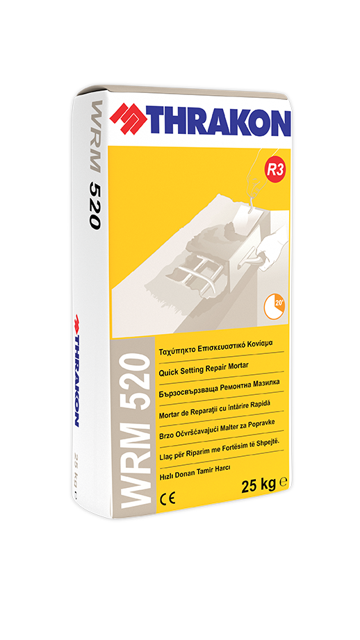 WRM 520 este un mortar de reparaţii pentru beton, monocomponent, pe bază de ciment, cu priză rapidă (20 minute) de tip PCC R3 conform EN 1504-3.